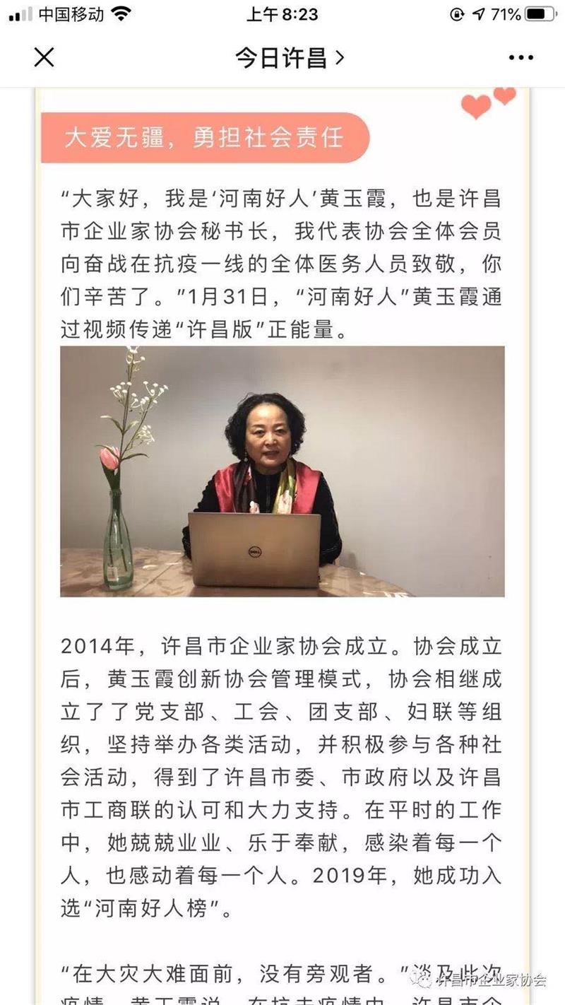 新冠病毒 來勢兇猛,時刻牽動著許昌市企業(yè)家協(xié)會 每一個 會員的心。在這場沒有硝煙的戰(zhàn)"疫" 中, 企業(yè)家協(xié)會積極響應(yīng)市委、市政府的號召,迅速行動,全力支援武漢、許昌等地區(qū)疫情防控, 為抗擊疫情貢獻 自己的一份力量。企業(yè)家 協(xié)會秘書長黃玉霞作為"河南好人"代表,通過《許昌晨報》視頻傳遞"許昌版"的正能量,她呼吁許昌企業(yè)家 奉獻愛心支援許昌、武漢,努力擔(dān)當(dāng)社會責(zé)任,共同抗擊疫情,共克時艱 。