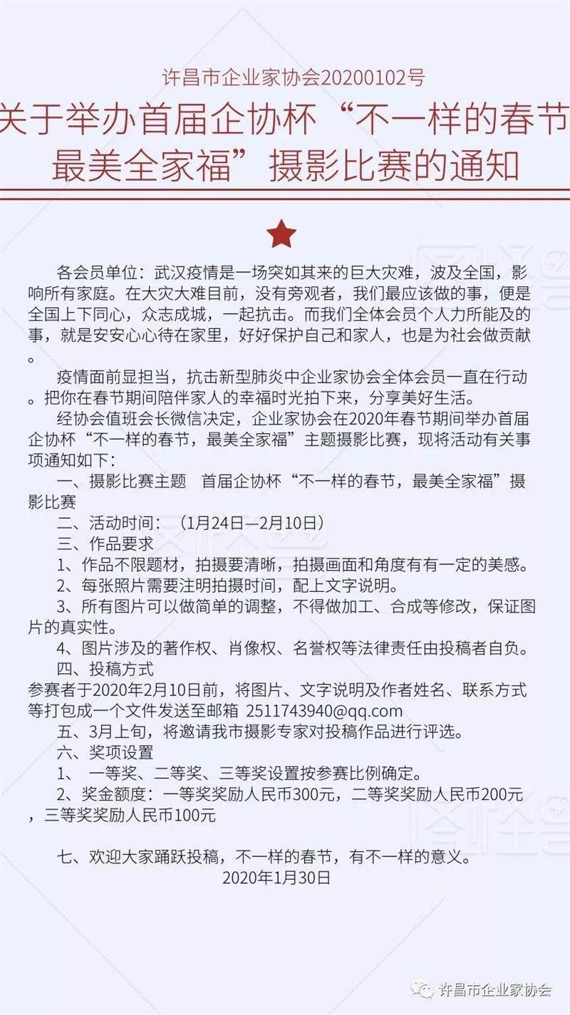 特殊時期,很多人不得不閉門在家減少聚會。許昌市企業(yè)家 協(xié)會擔(dān)心平日忙碌慣的會員一下子"窩"在家里不習(xí)慣,及時在微信群里發(fā)布了《關(guān)于舉辦首屆企協(xié)杯"不一樣的春節(jié),最美全家福"攝影比賽的通知 》,動員會員珍惜與家人團聚的美好時光,把與家人團圓的美麗畫面記錄下來,分享給大家。這項活動受到了廣大會員的稱贊,稱這是"不一樣的春節(jié),不一樣的祝福"。