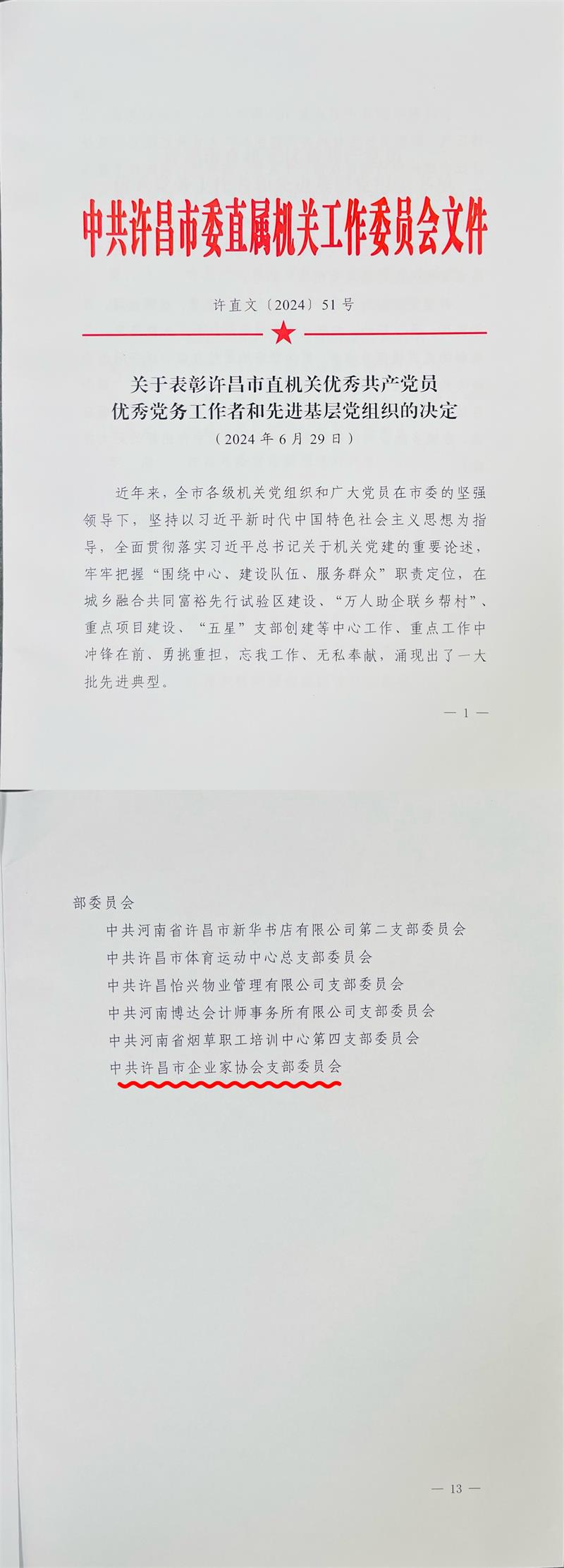 許昌市企業(yè)家協(xié)會黨支部榜上有名,被授予“許昌市直機關(guān)先進基層黨組織”榮譽稱號。