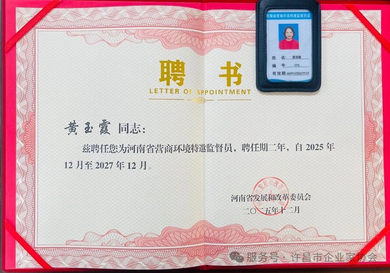 近日,河南省發(fā)展和改革委員會正式公布2025-2027年河南省營商環(huán)境特邀監(jiān)督員聘任名單,許昌市企業(yè)家協(xié)會秘書長黃玉霞成功入選,擔(dān)任新一屆特邀監(jiān)督員。